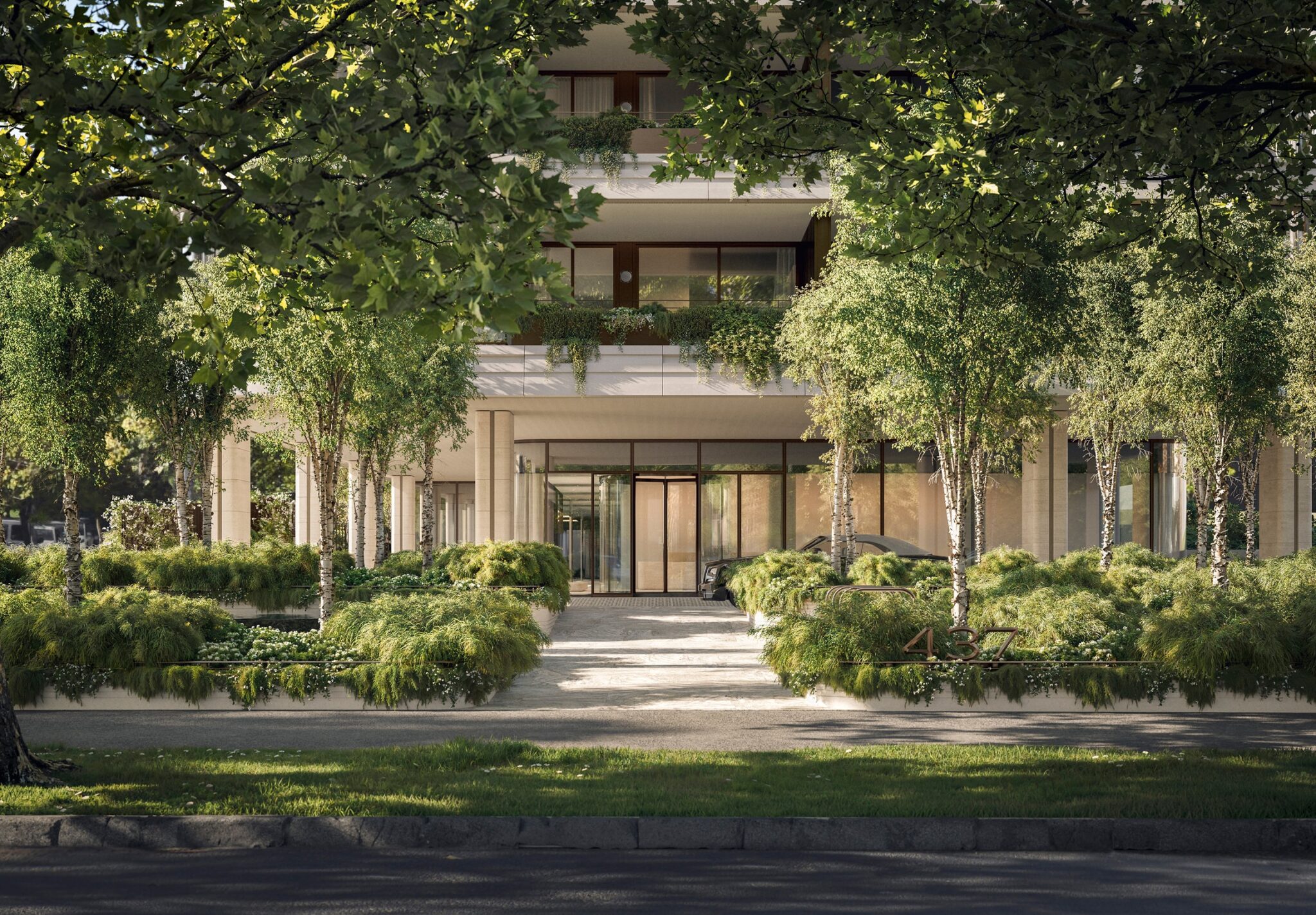 The elegant porte cochère, framed by lush foliage, provides a grand arrival from the boulevard. Alternatively, private access from the calm of Slater Street creates a more discreet welcome.